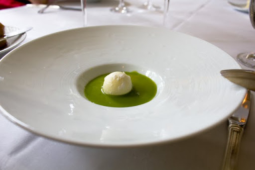 Først en lille apatizer: Olivenoliesorbet med grøn gazpacho. Simpel ret, og alligevel en fin lille start på menuen. Især isen var virkelig dejlig.Taskekrabbe med ærter, dild og saltet agurk. Skønne nuancer af grønt med en meget lækker creme i bunden med taskekrappe. Øverst var det frossen ærtesaft.Rokkevinge med nye kartofler, brunet smør og løvstikke. Eftermiddagens nok flotteste anretning og langt hen ad vejen en god ret. Men jeg synes faktisk der var lidt for meget rokkevinge, som syntes at blive lidt tør i munden - også selvom fisken egentlig slet ikke var tør. Men dog med rigtig gode toner i løvstikkeolien og små søde dråber, der matchede fisken rigtigt godt.Grønne asparges, kyllingevinge, parmesan og sommertrøffel. Virkelig lækre asparges og en vidunderlig skum af parmesan. Toppingen med sommertrøffel gav et fint twist, og heldigvis var trøffelsmagen ikke alt for overskyggende, som jeg synes trøfler ellers godt kan blive. Kyllingekødet var måske lidt kedeligt.Kalvekam og brissel med grillede løg og skovsyre. Ofte finder jeg hovedretten på fine restauranter noget af et antiklimaks. Men ikke her. Her var det hovedværket. De små ristede brissel, der lå oven på kødet var magisk samen med kalven. Og især den grønne puré af ramsløg og persillerødder var himmelsk.Rabarber med kærnemælk og estragon. Desserten så ikke ud af så meget, men den var virkelig vidunderlig. Lækker rabarberis, små bagte rabarberstykker og frossen kærnemælk - og så lidt estragon til at pifte smagen op ... dejligt.Tre fine petit fours fulgte kaffen og afrundede et dejligt måltid. Især vil jeg fremhæve kagen i forgrunden, der havde et fløjlsblødt indre af marcipan. Uhm. Flere af dem ...
